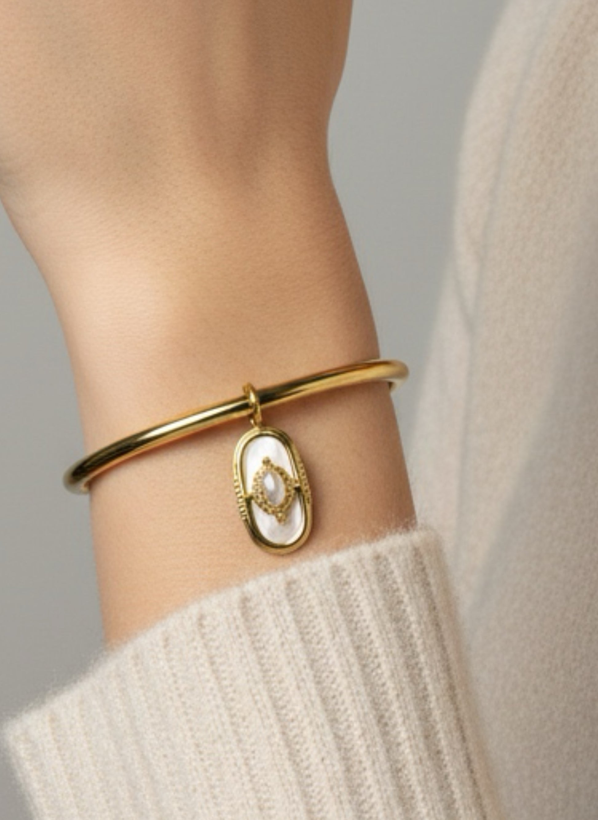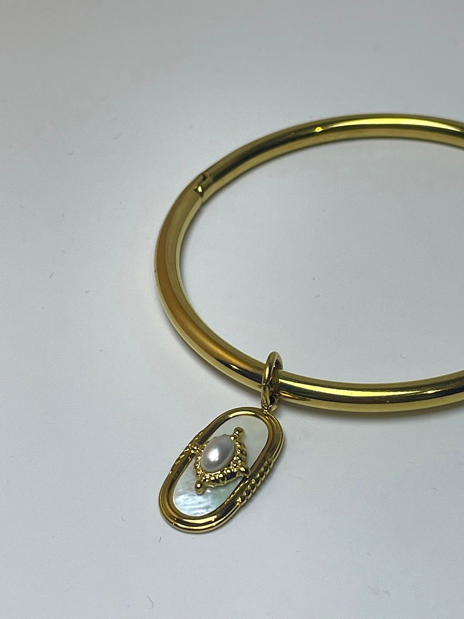 Symbole d’élégance céleste, ce bracelet doré et sa nacre perlée évoquent la pureté et la lumière des étoiles.