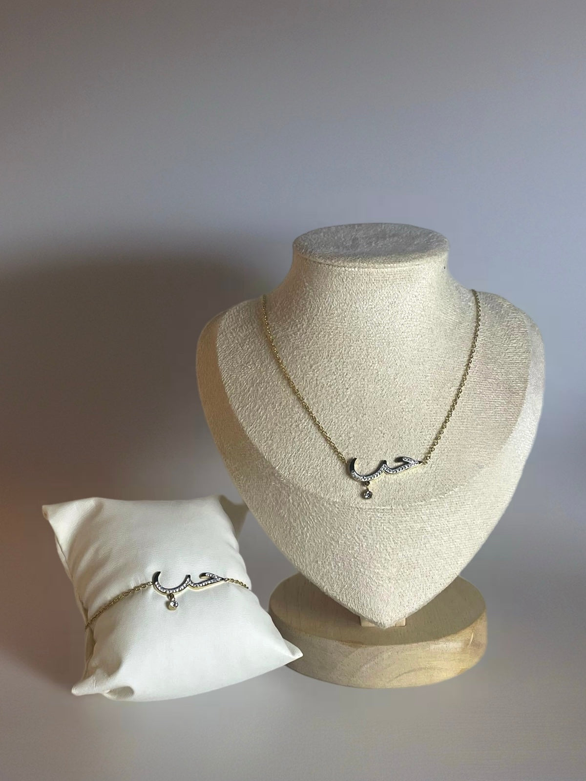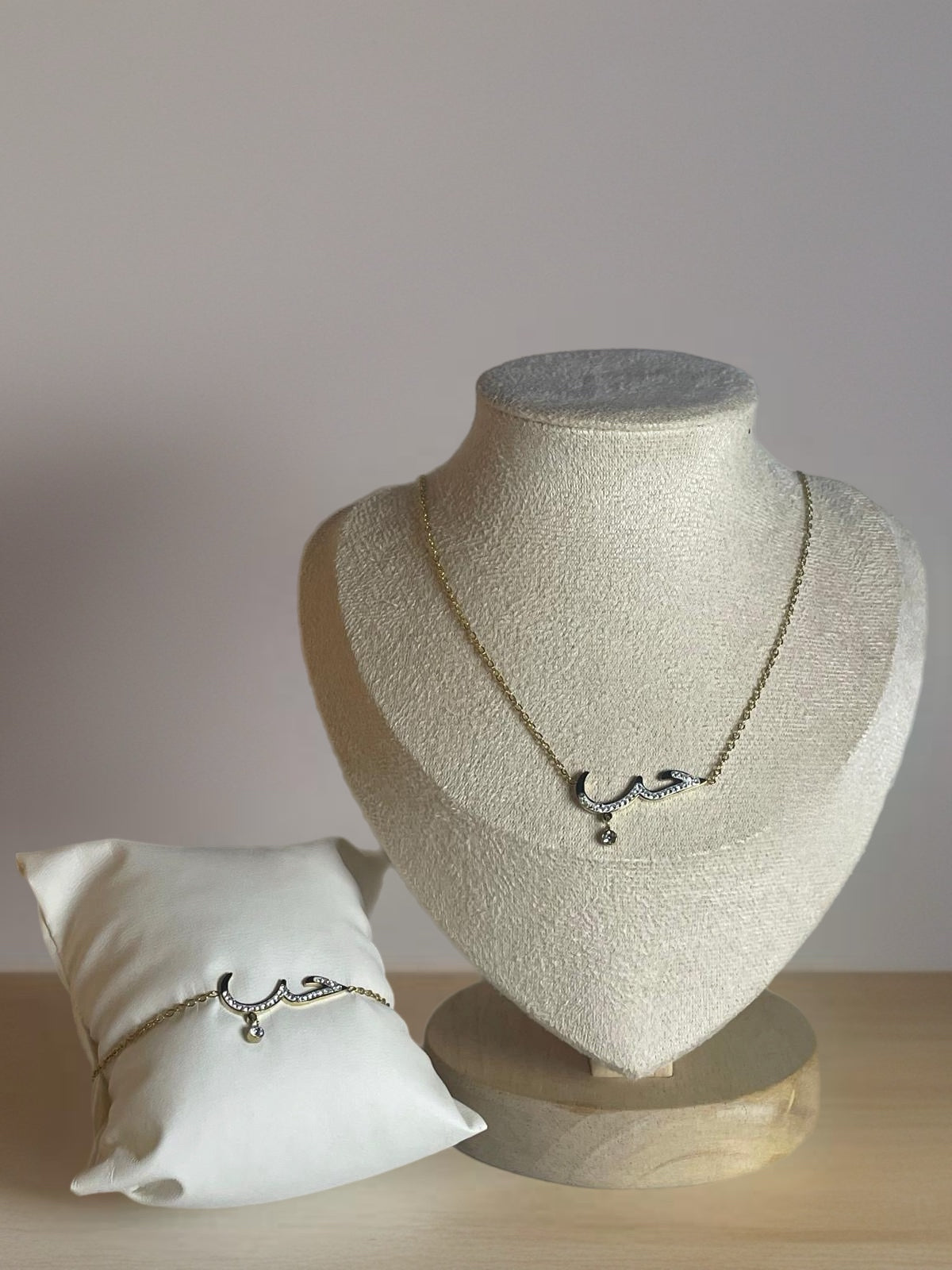 Composée d’un collier et d’un bracelet assorti, cette parure dorée se distingue par son inscription arabe حب (amour), sublimée de fines pierres étincelantes.