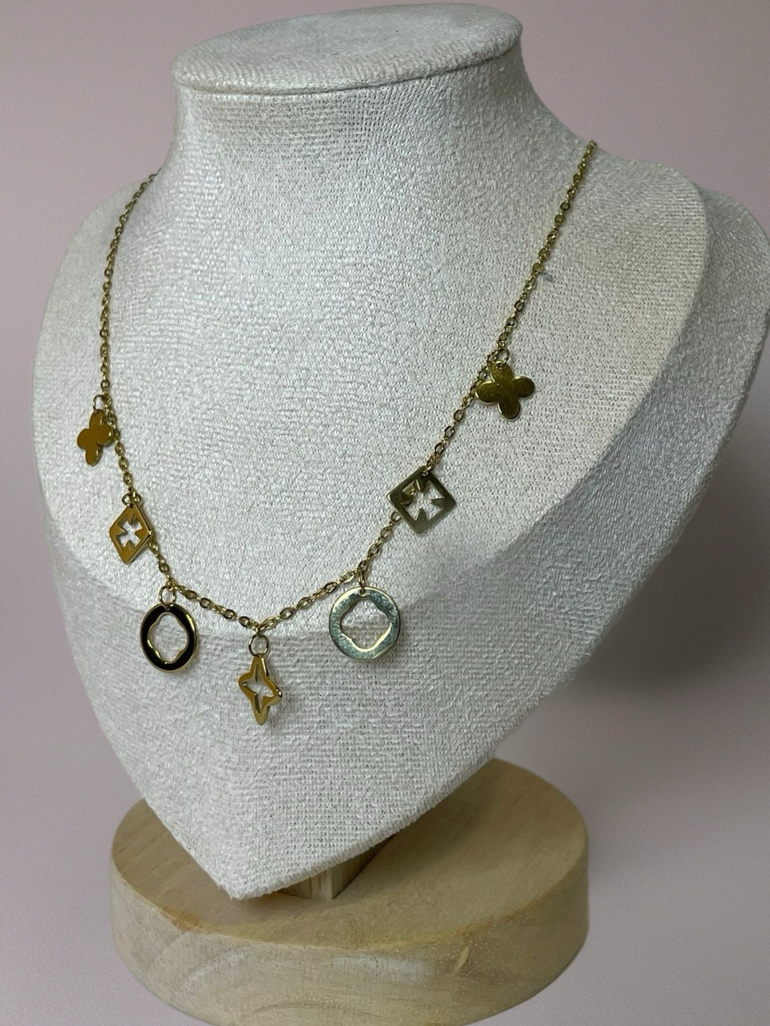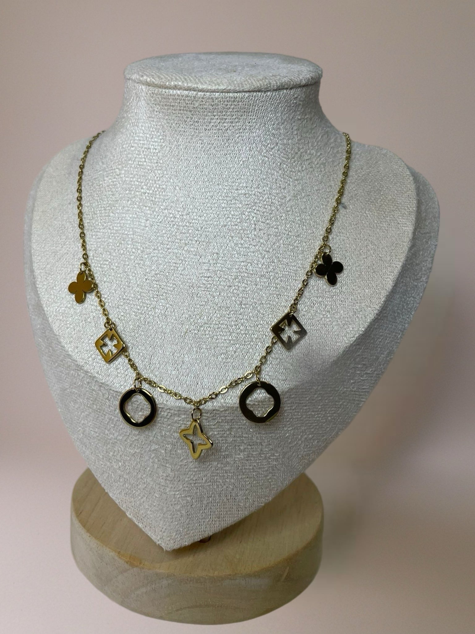 Le collier Charme Doré est une pièce raffinée qui mêle minimalisme et élégance. Composé de pendentifs géométriques et floraux délicatement suspendus à une fine chaîne dorée, il symbolise la féminité moderne et la liberté d’expression. Chaque breloque reflète la lumière avec subtilité, sans brillance excessive, pour un rendu chic et naturel.